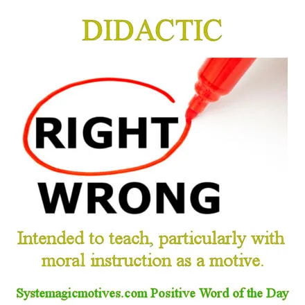 Overall, "didactic" underscores the intent to educate and inform through structured guidance and instruction. It highlights the role of communication in not only presenting information but also in shaping the audience�s understanding and values. Whether in educational settings or creative works, the didactic approach serves as a tool for imparting knowledge and fostering learning.
