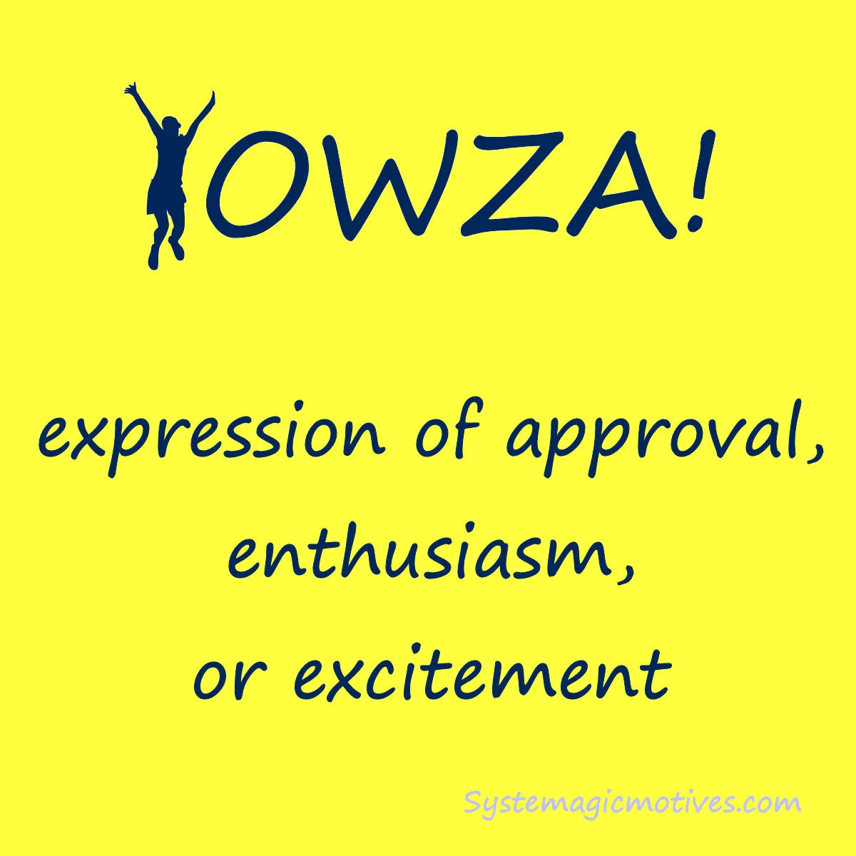 Aah! (Surprise) Aaah! (Satisfaction) Cool! Cheers Cheers! Gramercy! Hallelujah! Hurray! Huzzah! Joy! Kudos! Love this/it! Oooo! Ta-da! Vivat! Whee! Woo-Hoo! Yay! Yes! Yippy! You Rock! Yowza!